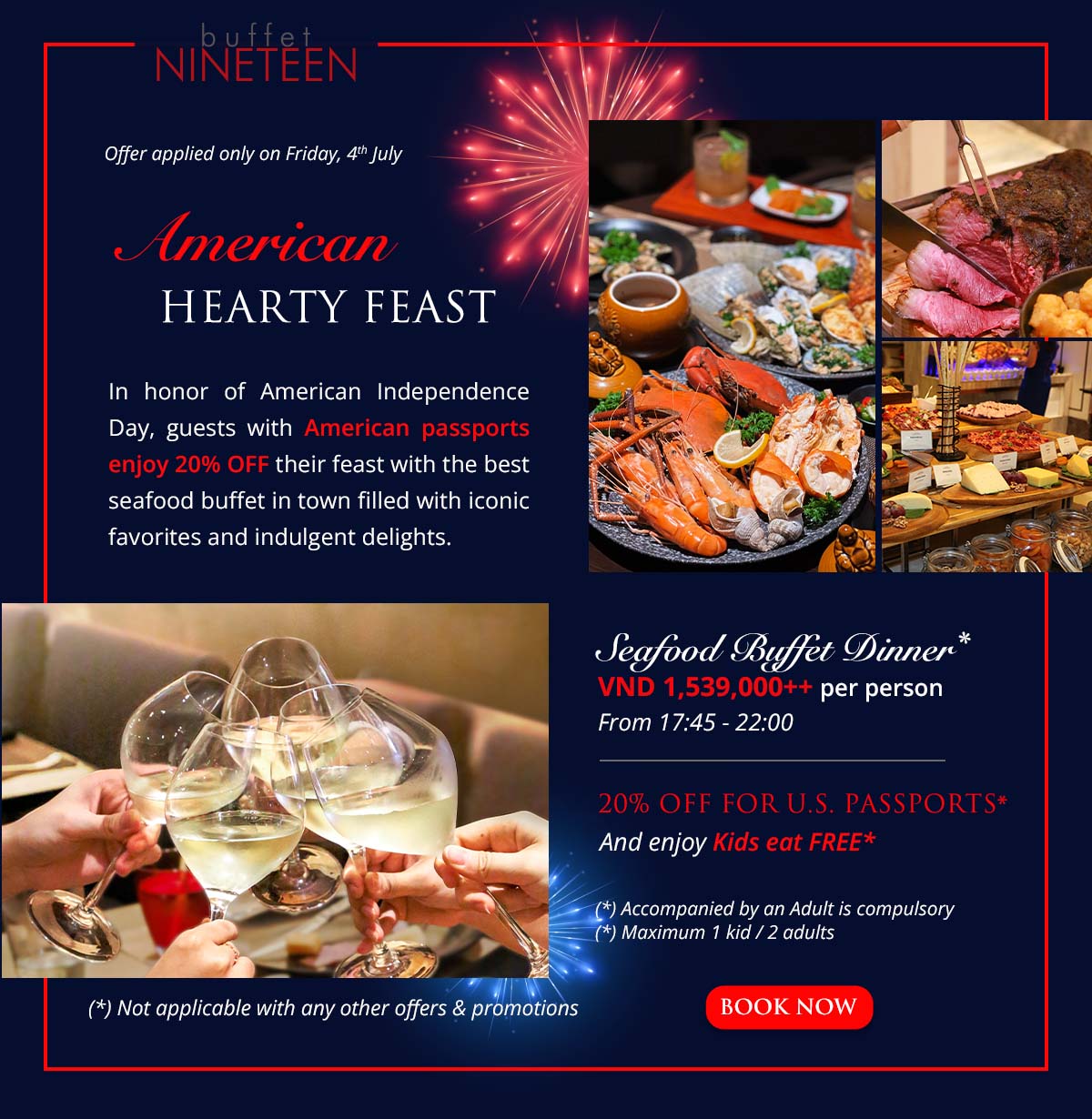 In honor of American Independence Day, on Friday, July 4th, guests with American passports enjoy 20% OFF their feast at Buffet NINETEEN, featuring the best seafood buffet in town, filled with iconic favorites and indulgent delights. Besides lavish seafood, savor iconic offerings like premium Wagyu beef burgers, flavorful hot dog, crispy fried chicken, cheese & cold cuts. Treat yourself to premium Texas BBQ beef rib and Coca-Cola BBQ pork ribs at the Carving Station and conclude your feast with the sweet delights of classic Apple pies & New York cheesecake.