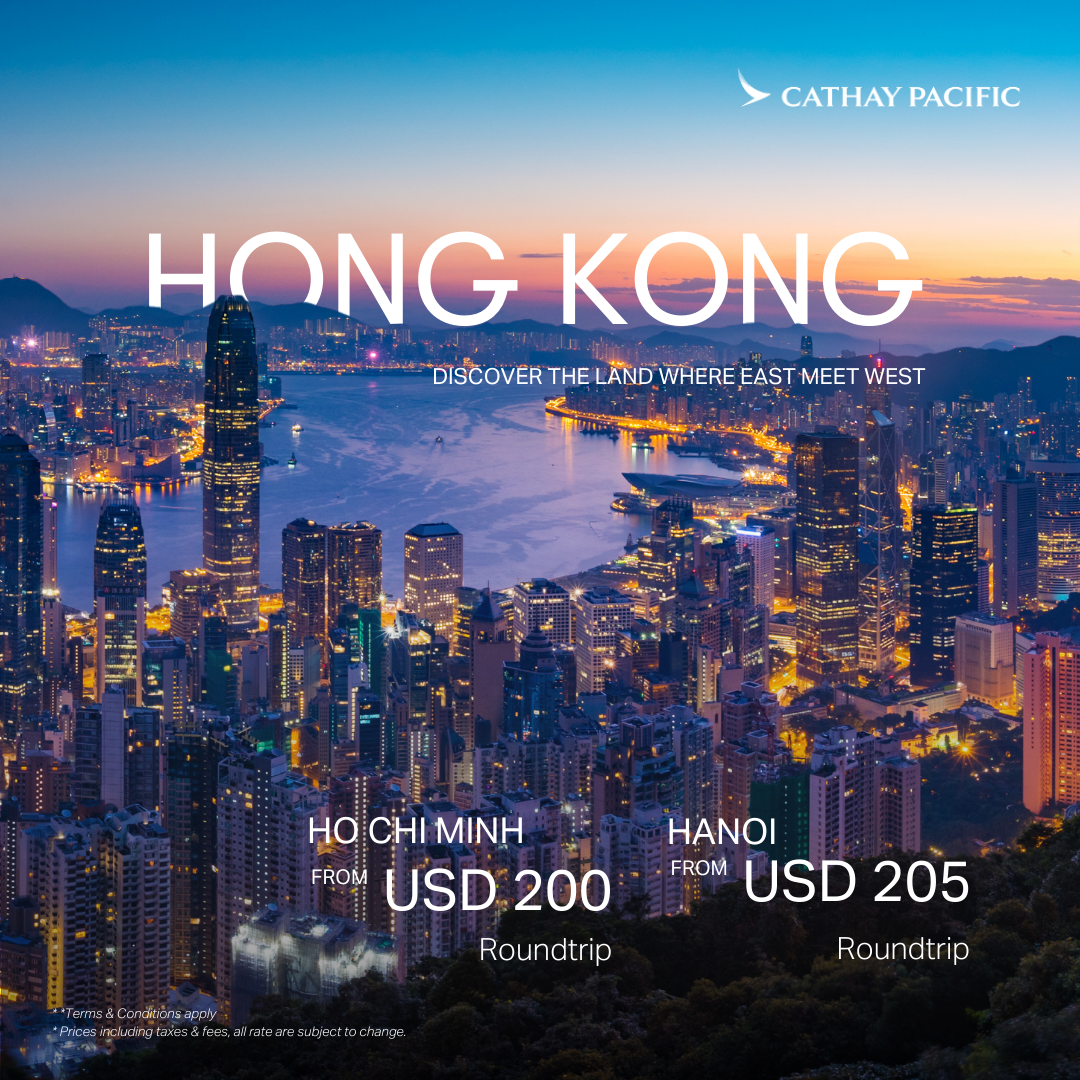 Fly Hong Kong from Vietnam, explore the bustling streets, cultivated experiences through art, attractions, scenery, and cuisine like no other. Fall in love again with the scenic harbour and at the city of Asia from only USD200* all-in on a roundtrip flight.