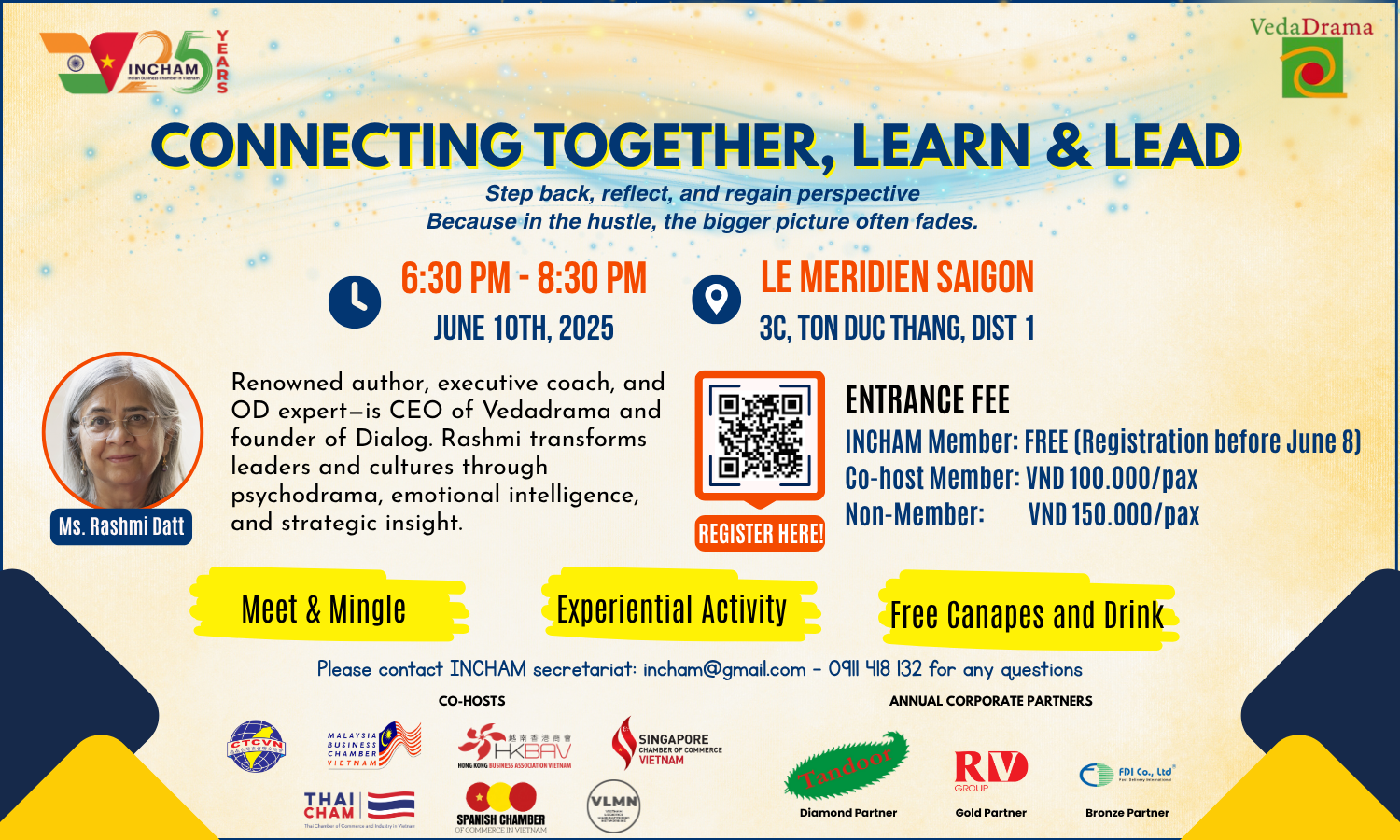 We are pleased to announce that INCHAM in collaboration with VedaDrama is organizing Networking Night - “Connect Together, Learn & Lead” - an opportunity to connect, enjoy experiential activity with the expert on June 10th, 2025 at Le Meridien Saigon.