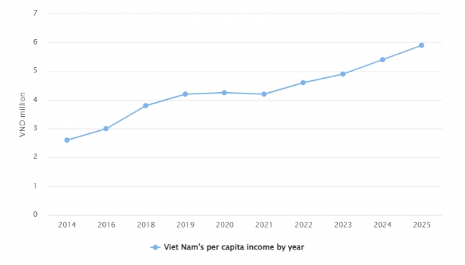 Average per capita income in 2025 was estimated at VND5.9 million (approximately US$225) per month, marking a 9.3 percent increase from 2024, according to preliminary findings of the Household Living Standards Survey 2025 conducted by the National Statistics Office (NSO).