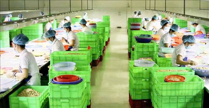 平福省“黄山1”有限责任公司的工人正在分类加工腰果。