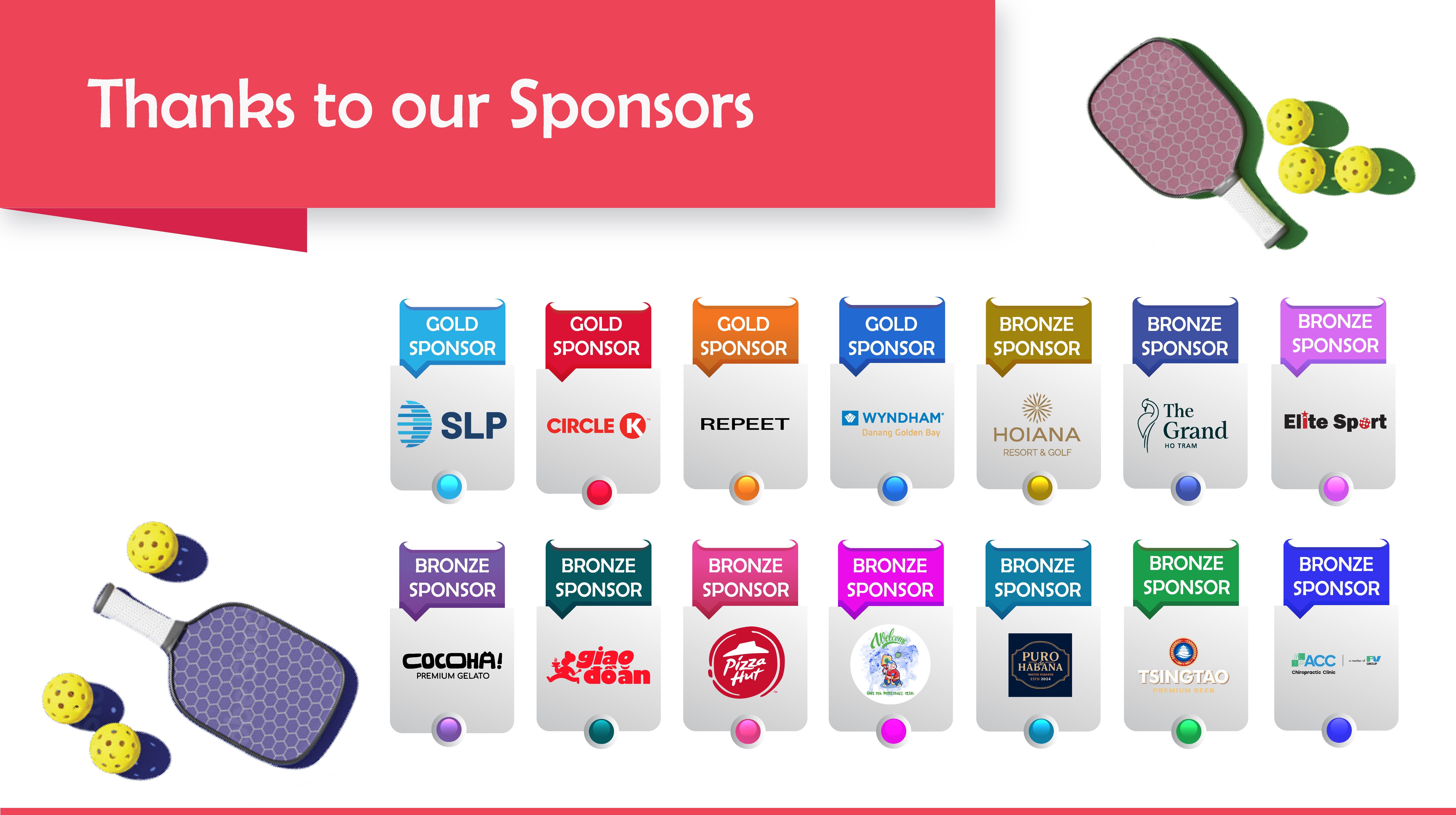 • Bronze Sponsors: Cocoha, Giao Do An, Hoiana Resort And Golf, Ong Dia Pickleball, Pizza Hut, The Grand Ho Tram