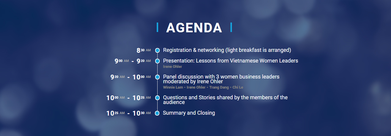 This event aims to inspire and encourage action. We'll inspire through stories of outstanding Vietnamese and international women business leaders. The panel discussion will focus on moving towards action, and how we can enable more women to break through the bamboo ceiling in their organisations.