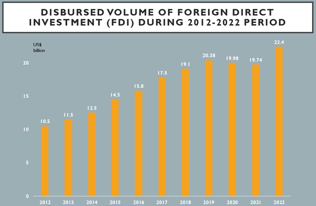 The total disbursed volume of foreign direct investment (FDI) in 2022 hits US$22.4 billion, the highest figure recorded over the recent decade