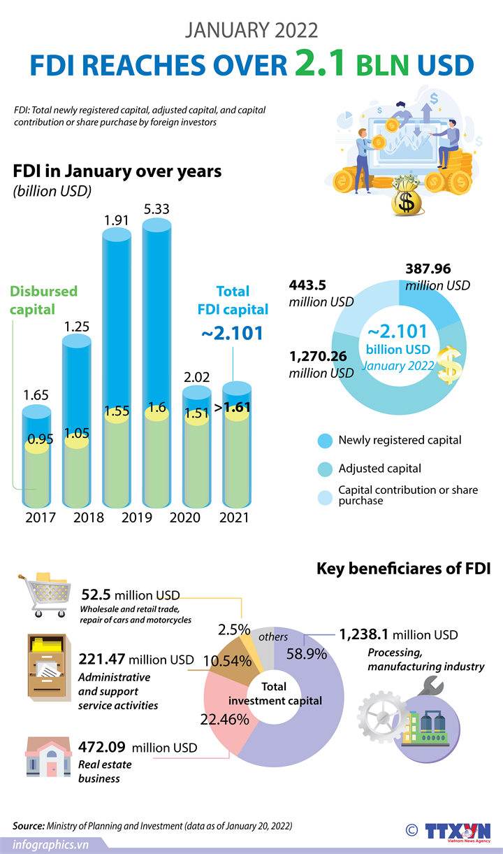 The inflow of foreign investment into Vietnam hit over 2.1 billion as of January 20, up 4.2 percent year-on-year, marking good signals for the country's investment attraction, the latest report from the Foreign Investment Agency (FIA) showed.