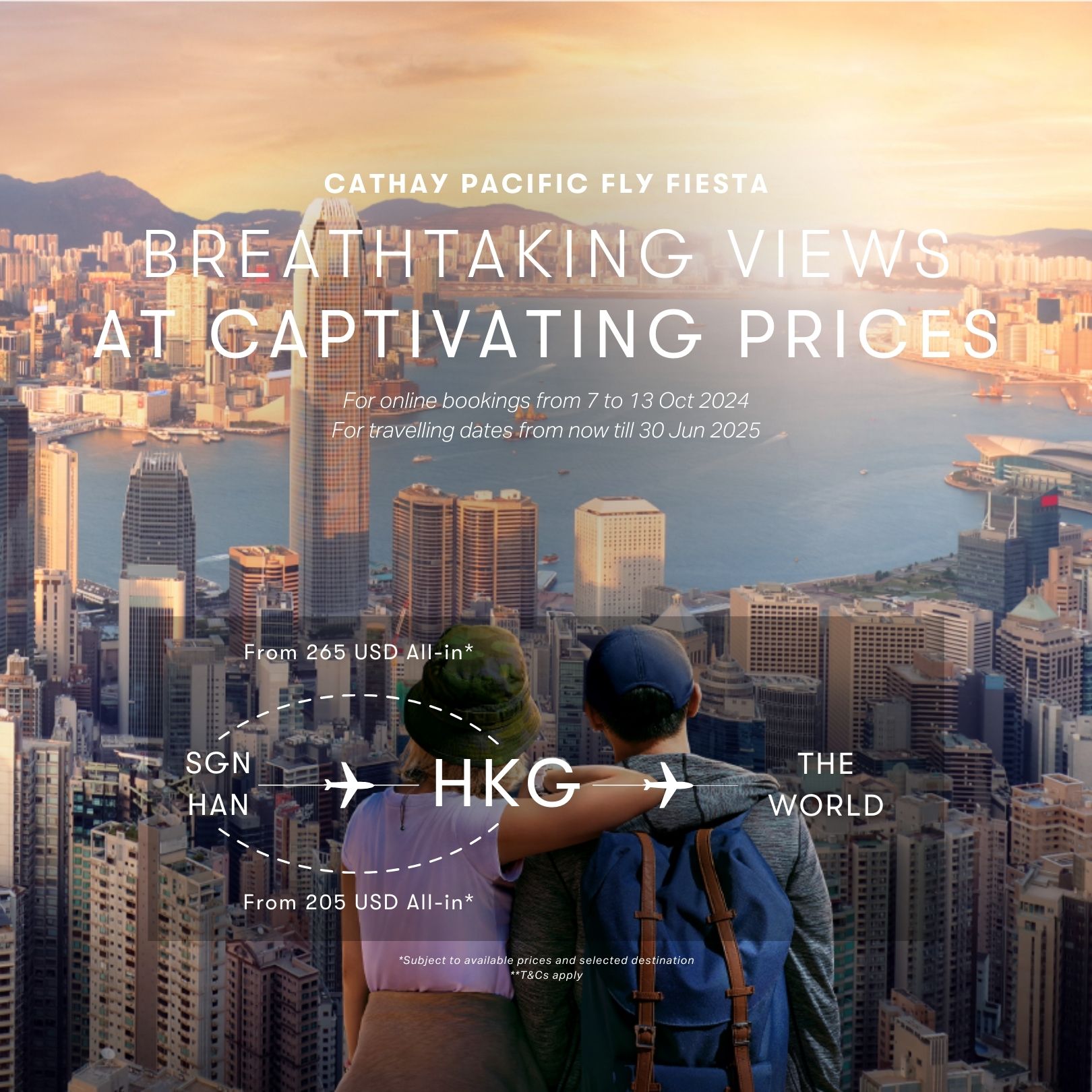 Bringing you breathtaking views at captivating prices from USD 205* all-in (for Hanoi - Hongkong roundtrip; for other destination, learn more at https://flights.cathaypacific.com/en_VN/offers/fly-fiesta-2024.html).