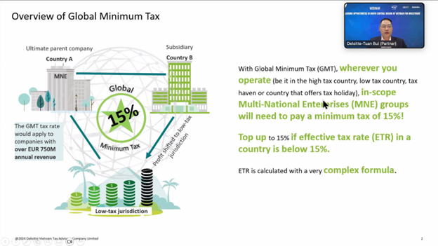 Mr. Bui Ngoc Tuan, Partner at Deloitte Vietnam, provided a comprehensive update on the Global Minimum Tax (GMT) framework, which is poised to reshape the global tax landscape. He outlined the key implications for multinational enterprises (MNEs) operating in Vietnam, where GMT regulations will take effect in January 2024. His presentation focused on how Vietnam’s Qualified Domestic Minimum Top-up Tax (QDMTT) and other GMT mechanisms will impact MNEs, particularly those currently benefiting from preferential tax rates.