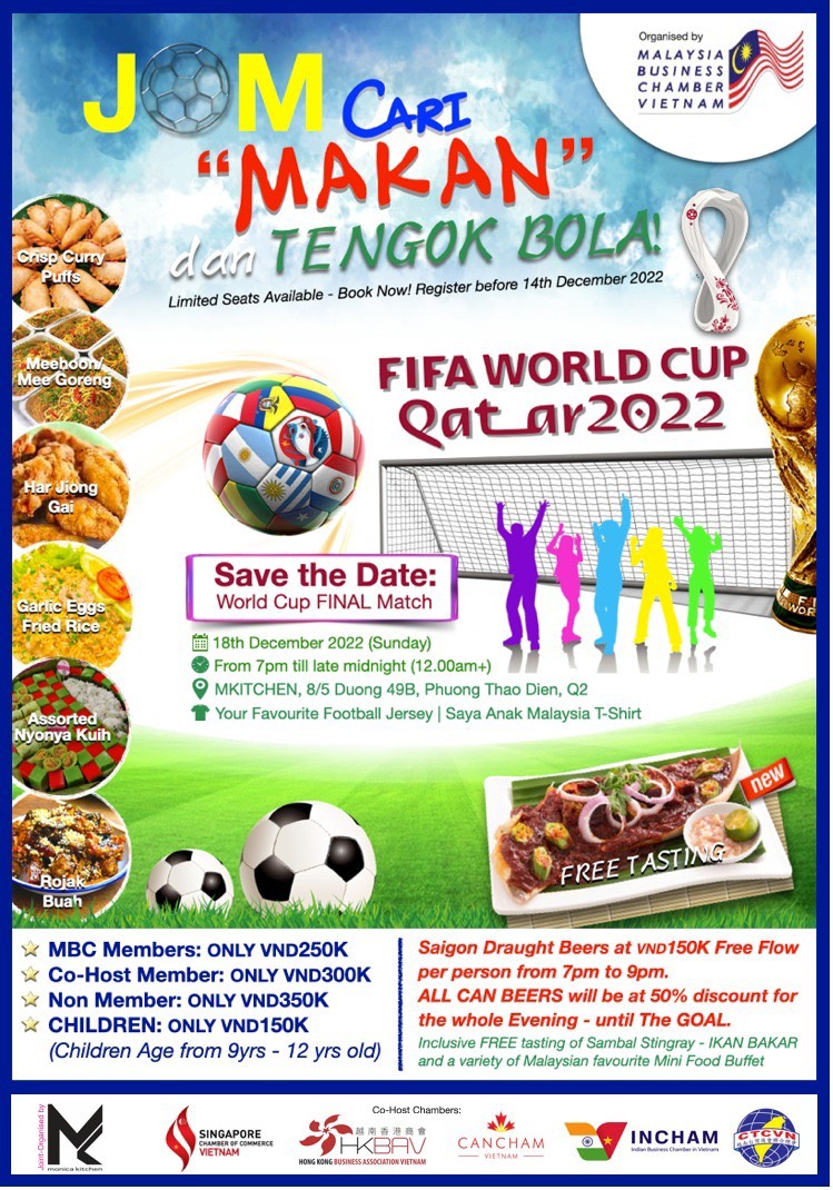 Enjoy the FIFA World Cup Final Match on 18th December 2022 (Sunday) with us! Saigon draught beers at VND150K free flow per person from 7:00pm to 9:00pm, ALL CAN BEERS will be at 50% discount for the whole evening until goal.