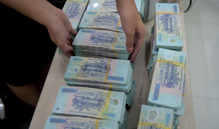 A bank teller handles stacks of Vietnamese banknotes - PHOTO: LE VU