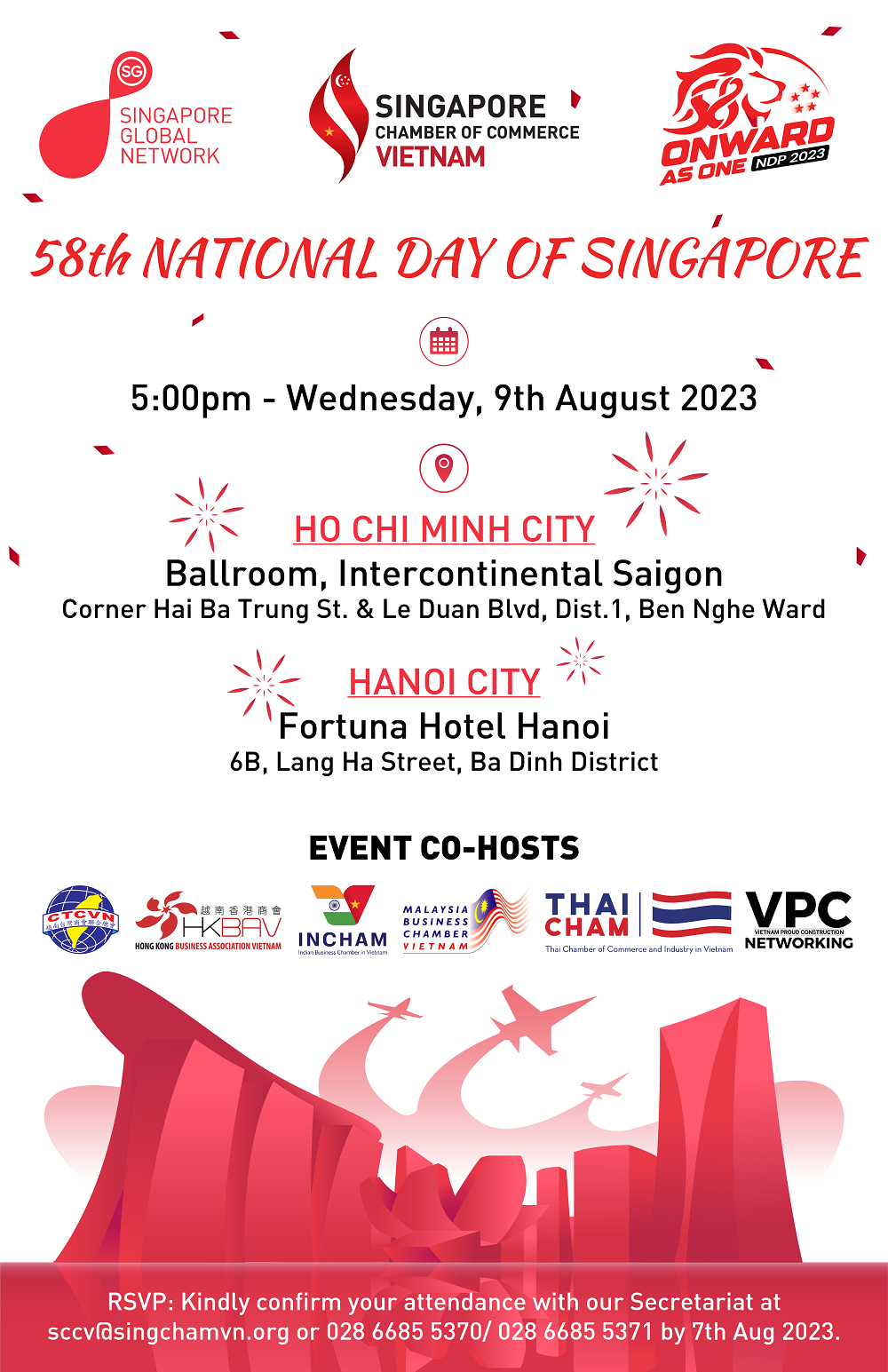 The Singapore Chamber of Commerce Vietnam (SCCV) is delighted to invite you to celebrate with us Singapore 58th National Day 2023 – Onward As One! calling upon Singaporeans to look forward confidently and move onward together in building a shared future as one.