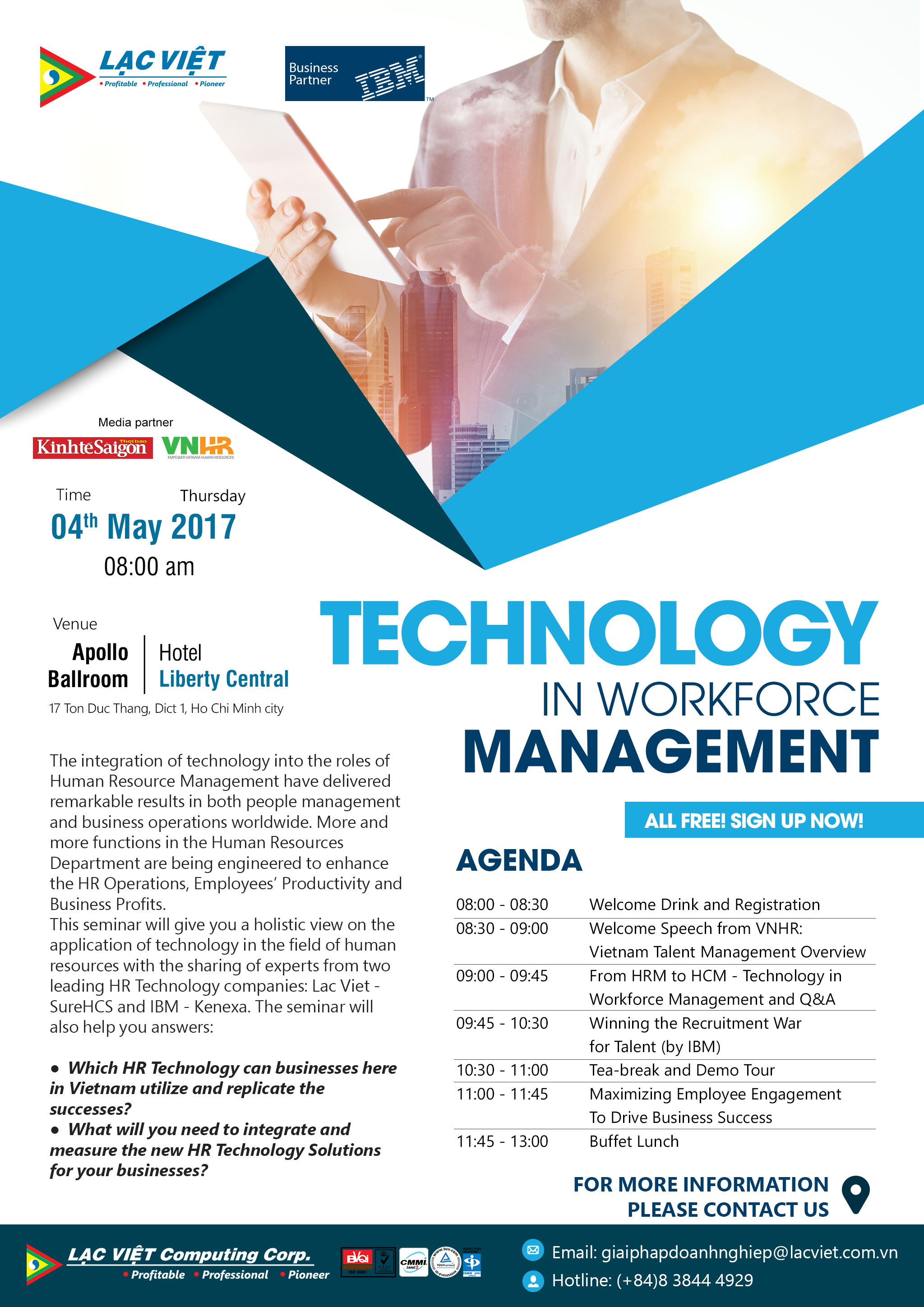 This seminar will give you a holistic view on the application of technology in the field of human resources with the sharing of experts from two leading HR Technology companies: Lac Viet – SureHCS and IBM – Kenexa. The seminar will also help you answers: