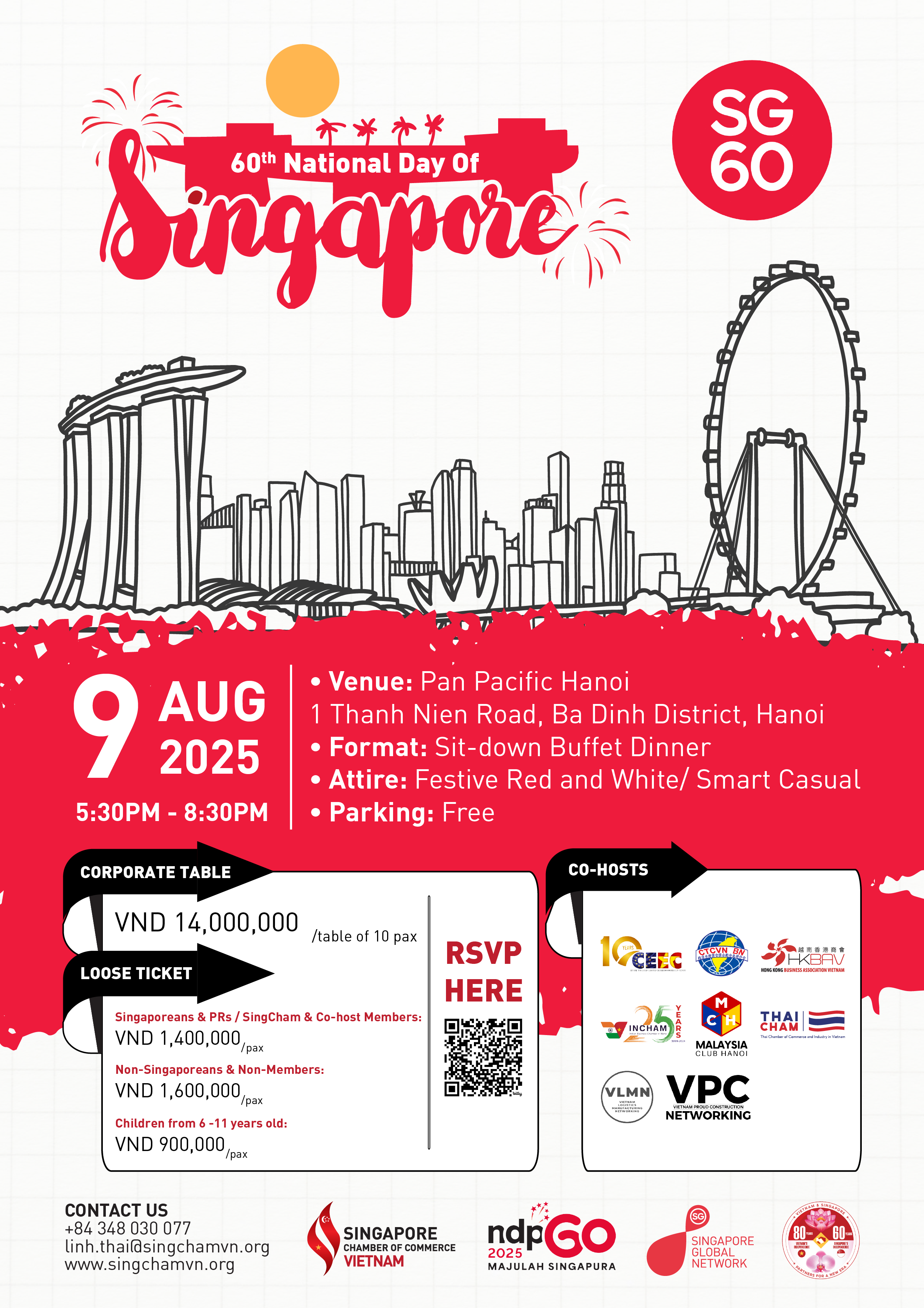 The Singapore Chamber of Commerce Vietnam (SingCham Vietnam), Hanoi Chapter warmly invites you to join us in celebrating a remarkable milestone - Singapore’s 60th year of independence.