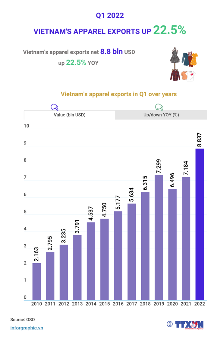 VIETNAM'S APPAREL EXPORTS IN Q1 2022 JUMPS 22.5%