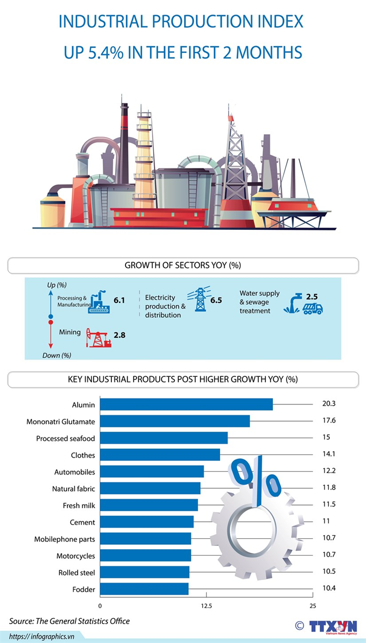 VIETNAM'S INDUSTRIAL PRODUCTION UP 5.4 PCT IN FIRST 2 MONTHS